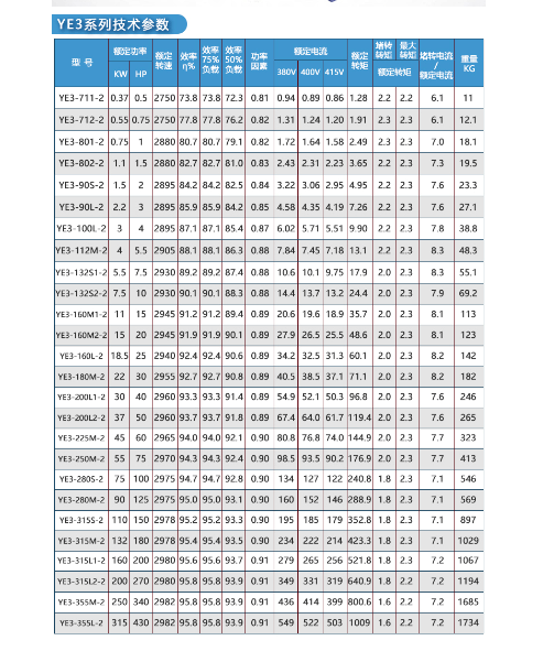 YE3系列三相異步電機生產起始于2010年,YE3系列三相異步電機固定為2級能耗,YE3系列三相異步電機是升級版超高效電機。YE3系列三相異步電機采用了新的電動機設計、新技術以及新材料。它減少了電磁能,熱能和機械能的損失,并提高了電動機的輸出效率。YE3系列三相異步電機具有效率高(平均比YE2系列電機高出3%以上)和明顯的節能效果的優點。它們可以完全替代YE2和YX3系列高效電機。